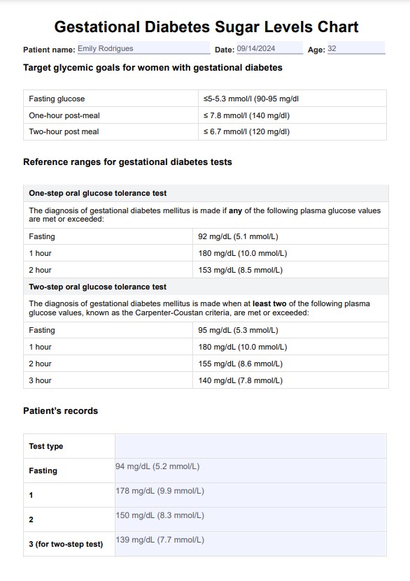 احصل على إمكانية الوصول إلى مخطط مستوى السكر في سكري الحمل مجانًا. استخدمه كمرجع لمراقبة وإدارة مستويات السكر في دم مريضتك أثناء الحمل.