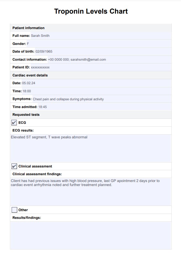 医疗专业人员使用肌钙蛋白水平表轻松高效地整理血液检查结果,以便快速访问以帮助诊断严重的心脏事件。