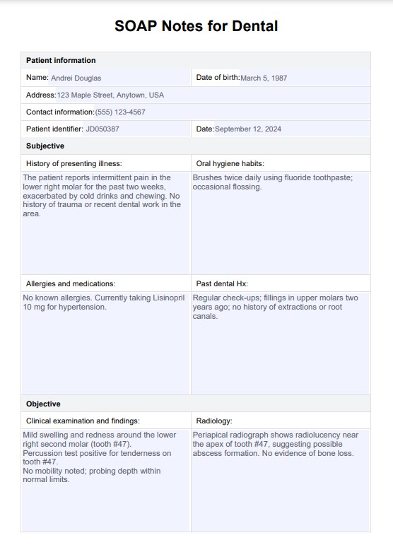 Resultater fra en dental røntgen skal registreres i afsnittet „Objektiv“ i SOAP-noter. Dette afsnit indeholder alle observerbare data fra kliniske undersøgelser og diagnostisk billeddannelse. Detaljer røntgenfundene, såsom eventuelle abnormiteter, knoglestrukturer, eller tegn på forfald, sammen med relevante målinger eller sammenligninger.