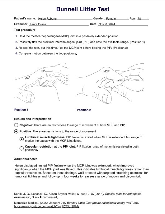 Der Bunnel Littler-Test wird verwendet, um die intrinsische Spannung der Finger zu beurteilen. Er misst die Fähigkeit, das betroffene distale Interphalangealgelenk (DIP) des Fingers zu beugen und gleichzeitig das proximale Interphalangealgelenk (PIP) gestreckt zu halten.
