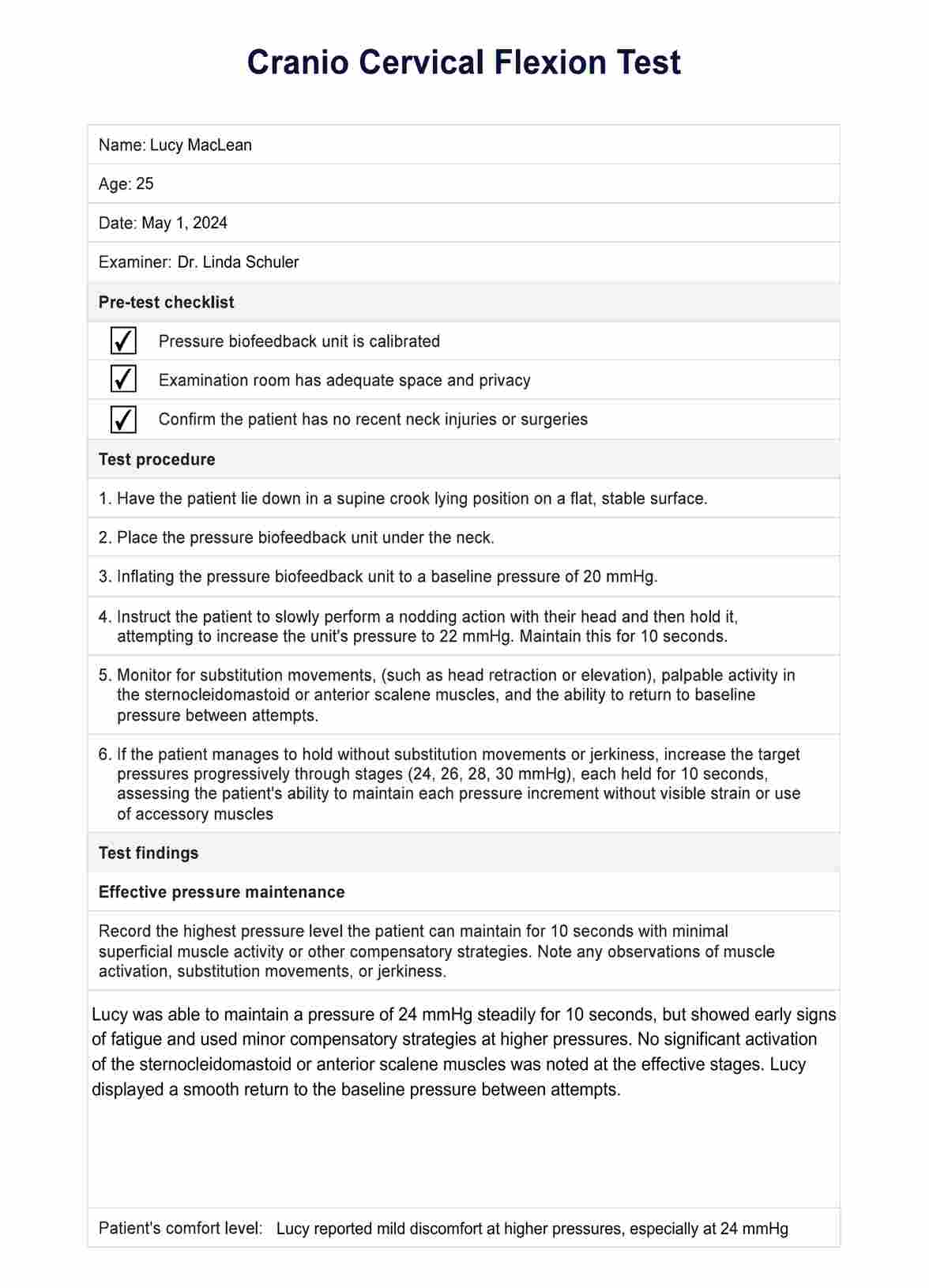 Optimieren Sie Ihre klinischen Untersuchungen mit unserer Vorlage für den Cranio Cervical Flexionstest. Perfekt für die effiziente und genaue Bewertung der Nackenmuskelfunktion.