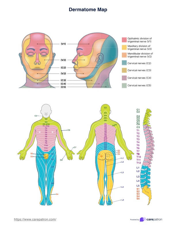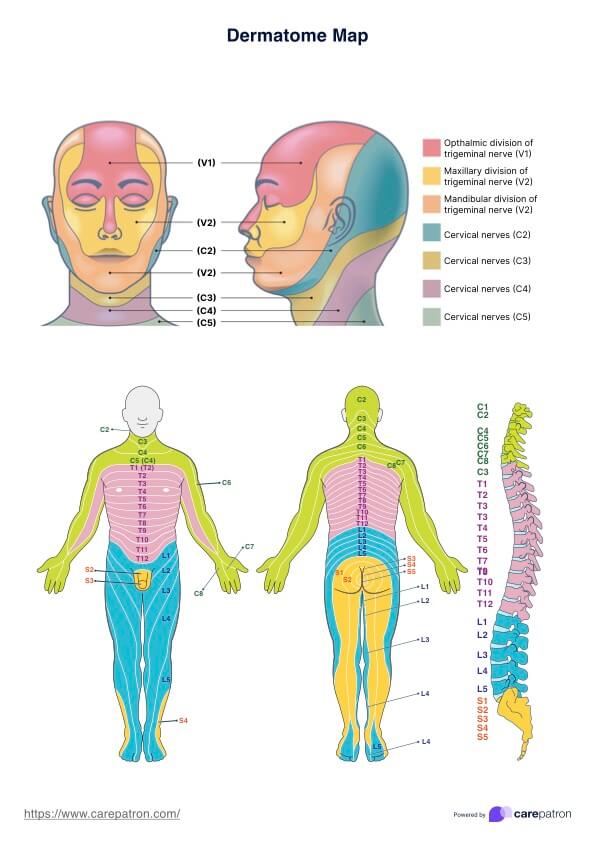 Die Dermatomkarte zeigt die Nervenverteilung im Körper. Verwenden Sie unsere Vorlage, um unser Diagramm der Dermatome des Kopfes, des Halses und des restlichen Körpers zu sehen.