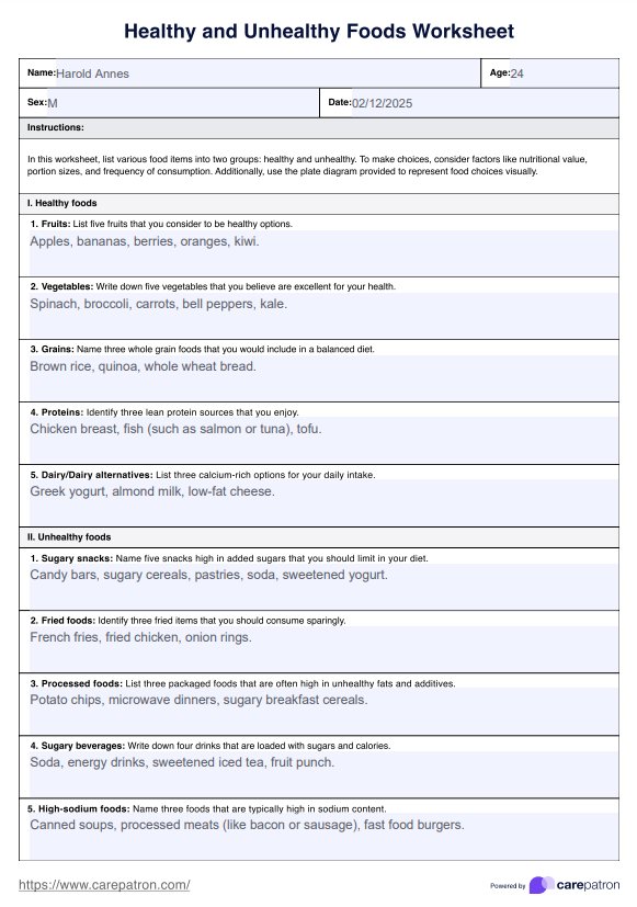Das Arbeitsblatt hilft Einzelpersonen dabei, ungesunde Essgewohnheiten zu erkennen, gesündere Gewohnheiten zu entwickeln und ihre Fortschritte bei der Erreichung von Ernährungszielen zu verfolgen.