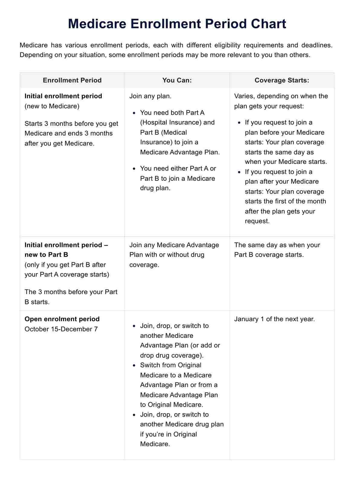 Holen Sie sich ein kostenloses Diagramm für den Medicare-Anmeldezeitraum, um Patienten zu helfen, die Medicare-Anmeldefristen zu verstehen. Laden Sie die PDF-Vorlage hier herunter.