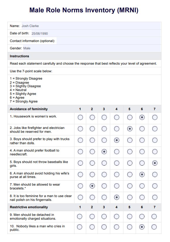 The Male Role Norms Inventory (MRNI) is a psychometric tool designed to assess adherence to masculine norms, including traits such as physical toughness, self-reliance, and the avoidance of behaviors seen as feminine. It evaluates masculine ideologies across various domains, including emotional expression, health behaviors, and societal expectations related to mechanical skills and leadership roles. The MRNI is widely utilized in research on men's health and mental health, helping to highlight the influence of gender role strain. By measuring general and specific masculinity factors, the inventory sheds light on how traditional norms contribute to health risk behaviors and the challenges men face in aligning with societal expectations, offering valuable insights into the relationship between masculine norms and gender role conflict.