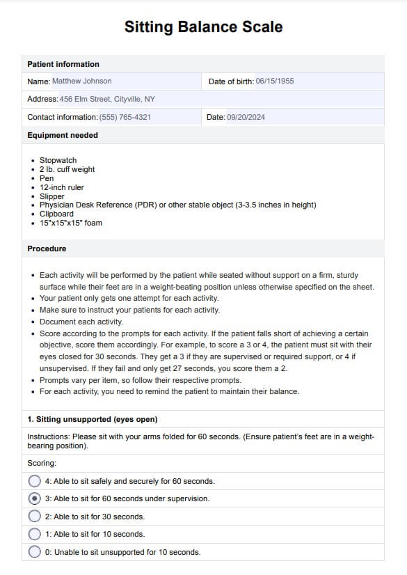 Verwenden Sie die Sitting Balance Scale, um die Fähigkeit von Patienten einzuschätzen, die größtenteils nicht ambulant arbeiten, sich im Sitzen, Stehen und Bewegen ins Gleichgewicht zu bringen.
