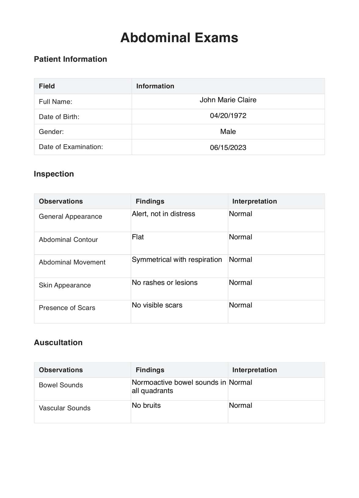 La Plantilla de exploración abdominal está diseñada explícitamente para exploraciones abdominales. Aunque proporciona un enfoque exhaustivo de esta evaluación concreta, puede que sólo sea adecuada para algunos tipos de exámenes médicos, que pueden requerir parámetros diferentes.