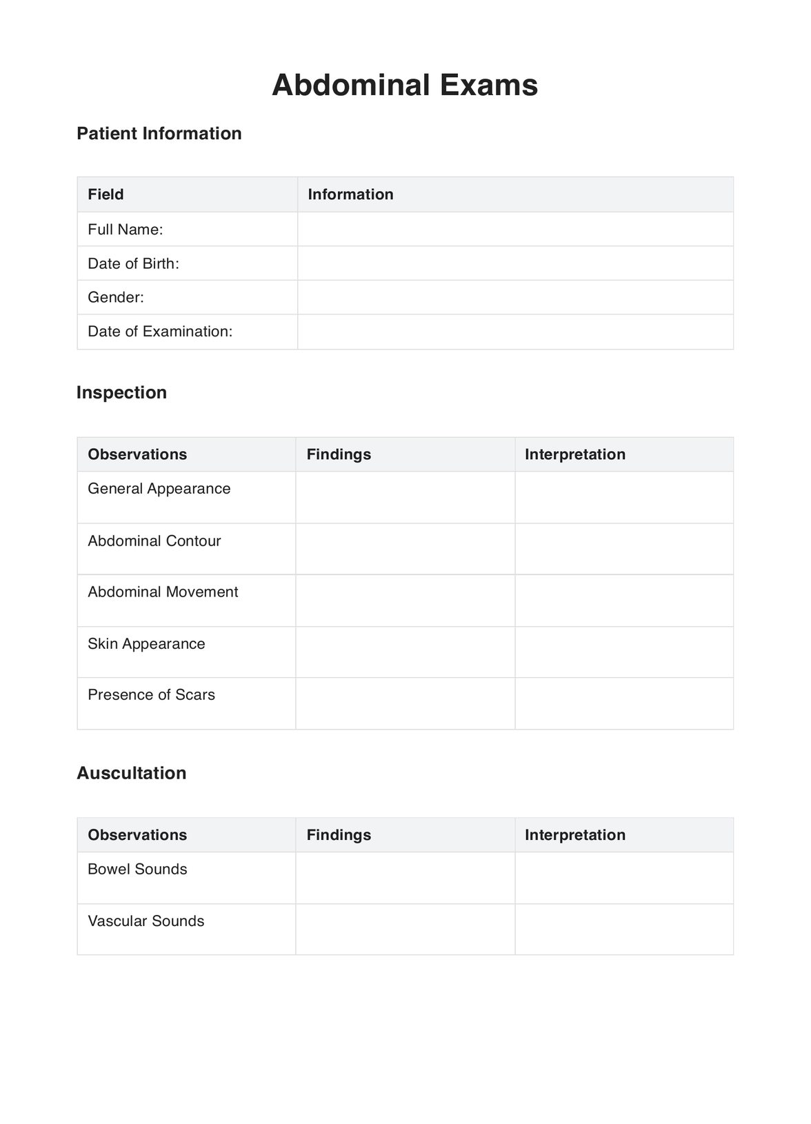 Domine los exámenes abdominales con nuestra completa guía y plantilla PDF gratuita. Agilice su consultorio con Carepatron, su aplicación ideal para exámenes abdominales.