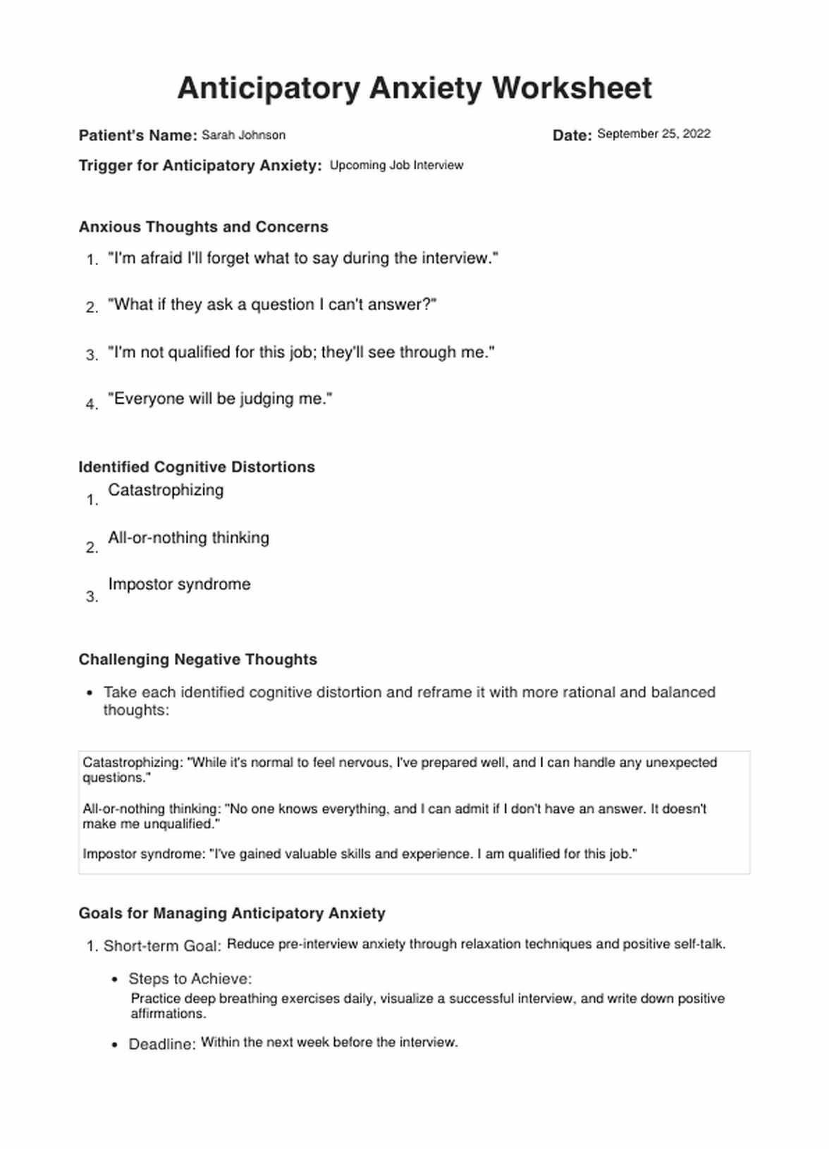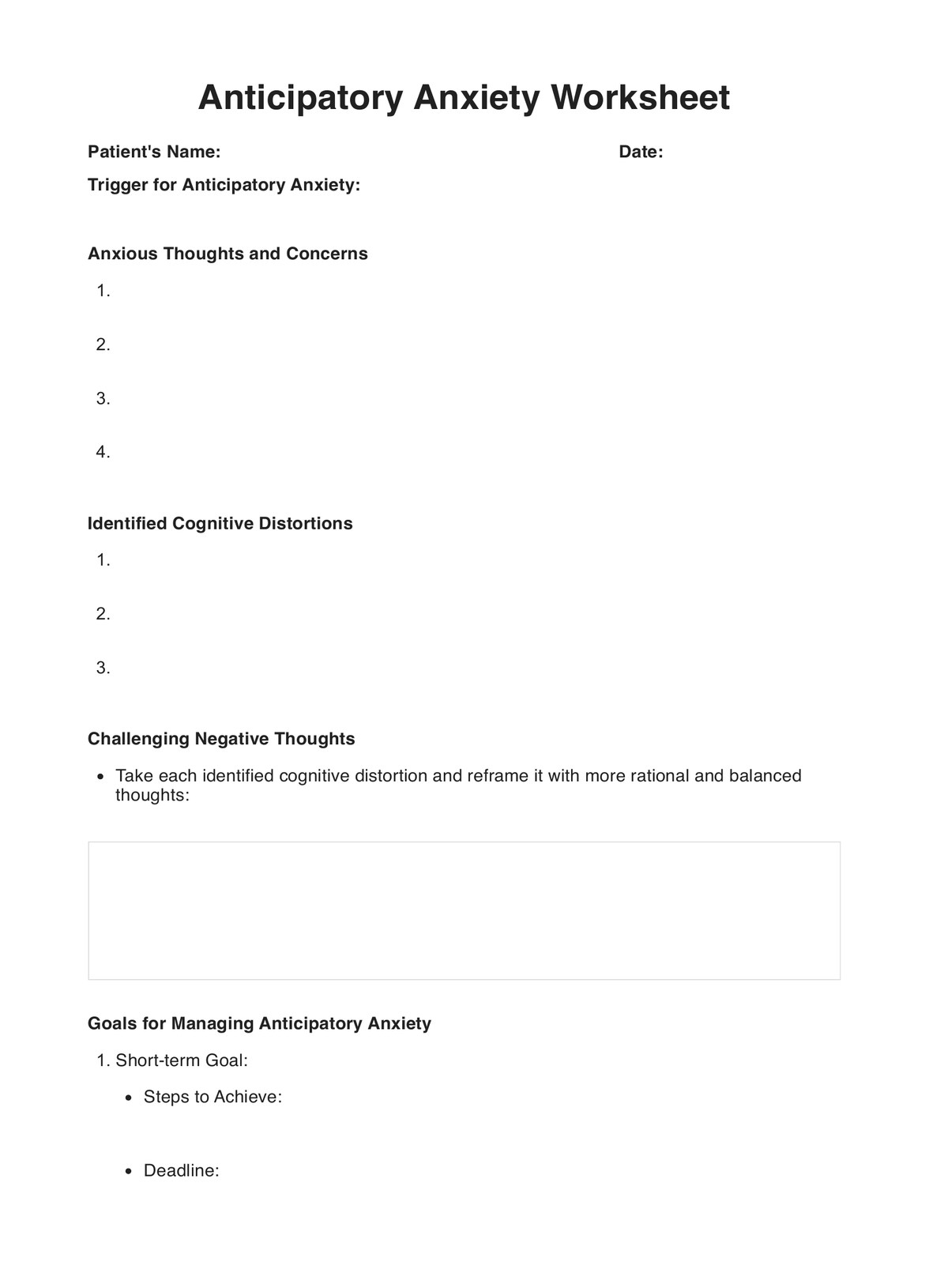 Hoja de ejercicios de ansiedad anticipatoria Template