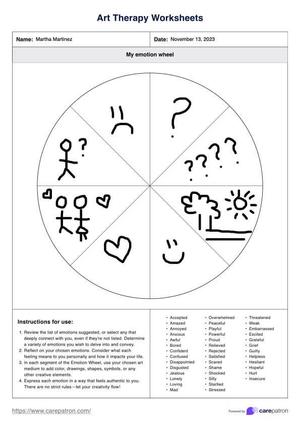 Una vez que su cliente haya completado la hoja de trabajo, un paso importante es repasar sus elecciones artísticas y las representaciones de cada emoción. Esta discusión puede ser enormemente beneficiosa para ayudar a su cliente a aprender a hablar de sus sentimientos y a generar confianza con usted. Independientemente de si conserva una copia de la hoja de trabajo original, asegúrese de guardarla de forma segura.