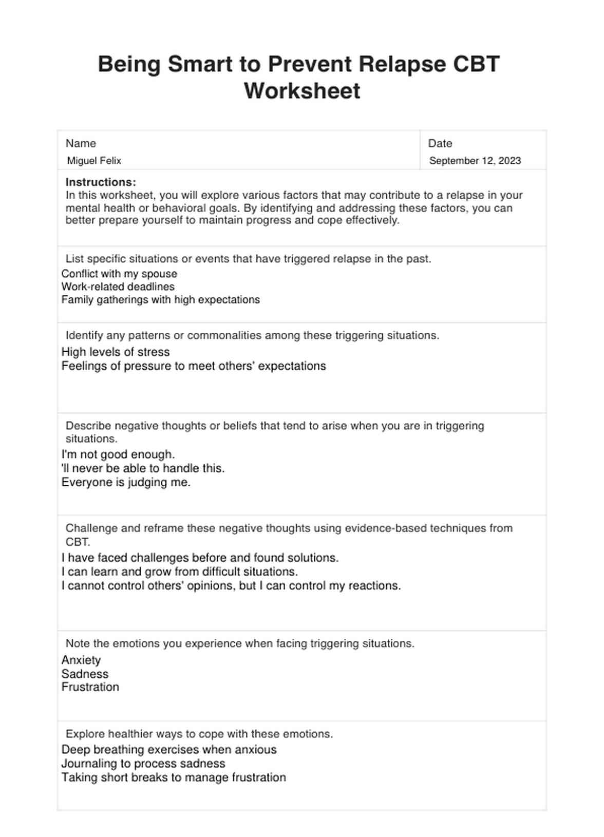 La hoja de trabajo de la TCC Ser inteligente para prevenir las recaídas capacita a los clientes para gestionar de forma proactiva su salud mental identificando los factores desencadenantes, reconociendo las señales de alarma y esbozando estrategias de afrontamiento. Fomenta la autorreflexión y la comunicación y constituye un registro tangible de los progresos realizados a lo largo de la terapia.