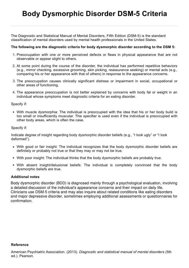 Consiga estos Criterios DSM-5 del trastorno dismórfico corporal para diagnosticar el TDC en pacientes, útiles en entornos de salud mental.