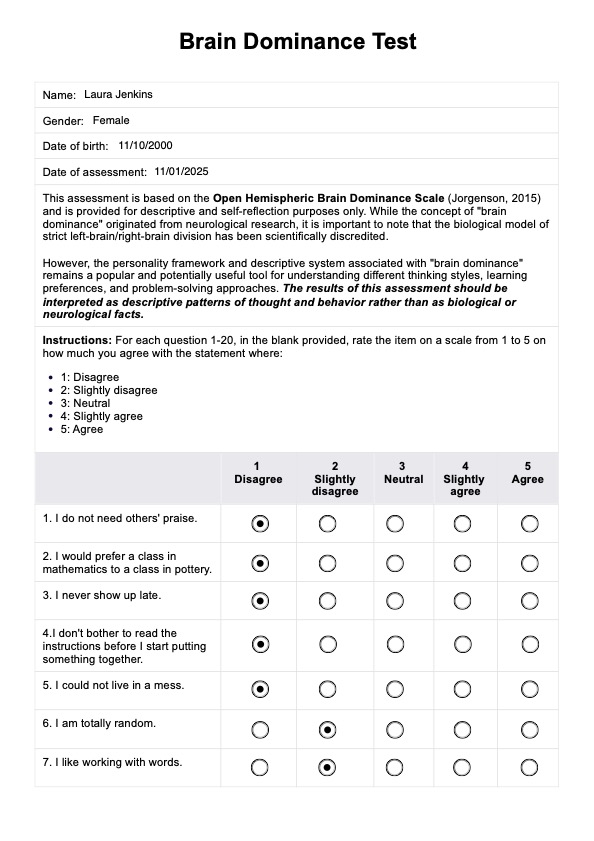 Utilice nuestra prueba de dominio cerebral para ayudar a los profesionales a evaluar los estilos de pensamiento, el dominio del cerebro y las tendencias cognitivas, lo que permite intervenciones personalizadas para sus clientes.
