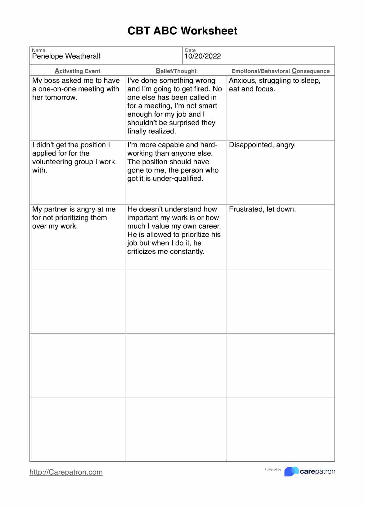 Nuestra hoja de trabajo TCC A B C está diseñada para ayudar a los pacientes a racionalizar sus patrones de pensamiento y mejorar su autoconversación. Fácil de acceder, compartir, utilizar y almacenar, esta hoja de trabajo conducirá a mejores resultados para todos.