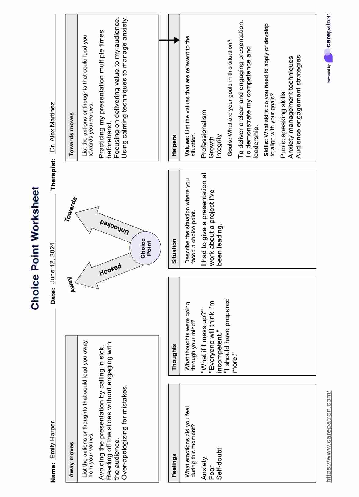 Absolutamente. La hoja de trabajo del punto de elección es una herramienta excelente en la terapia de compromiso, especialmente útil para las personas que luchan contra la ansiedad o los trastornos por consumo de sustancias. Utilizando esta hoja de trabajo, los pacientes pueden identificar puntos de decisión en su vida diaria en los que pueden elegir entre comportamientos antiguos y nuevos alineados con sus objetivos de recuperación. Este proceso es crucial para cambiar el comportamiento y reforzar la eficacia del tratamiento.