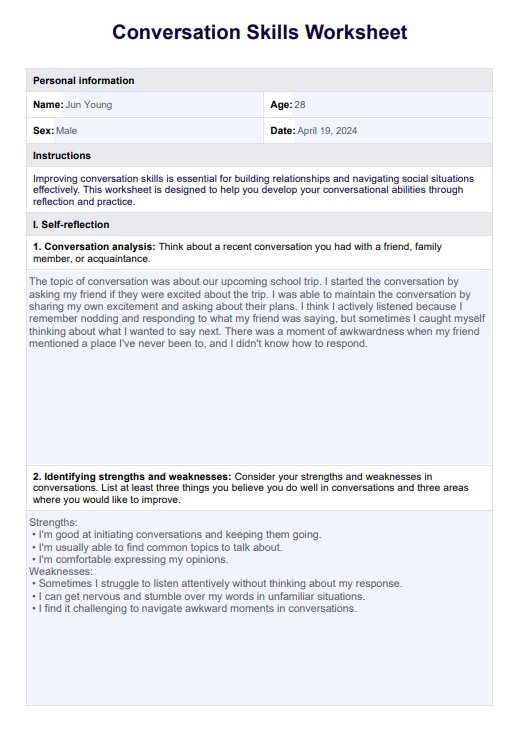 Mejore sus habilidades de conversación con nuestra atractiva Hoja de ejercicios de habilidades de conversación. Incluye ejercicios prácticos y fijación de objetivos. ¡Descárguela gratis hoy mismo!