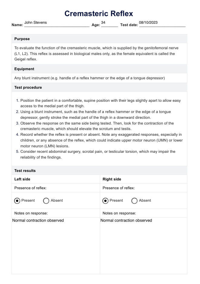 Agilice las evaluaciones y garantice una recopilación de datos precisa en sus evaluaciones clínicas con nuestra plantilla de la prueba del reflejo cremastérico. Obtenga más información en nuestra guía