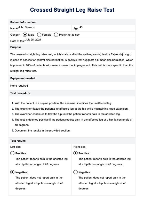 Evalúe eficazmente la hernia discal central con nuestra plantilla de la prueba de elevación cruzada de la pierna recta. Descargue aquí un recurso gratuito en PDF.