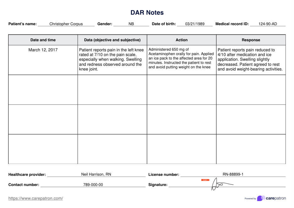 Por suerte, con nuestra plantilla de notas DAR no tendrá que preocuparse de la mayor parte del formato de sus notas DAR. Algunas personas pueden optar por añadir títulos o subtítulos adicionales, sólo tiene que asegurarse de que sean comprensibles para los demás miembros del equipo asistencial de su paciente, y si opta por utilizar acrónimos, asegúrese de que sean ampliamente comprendidos en su consultorio.