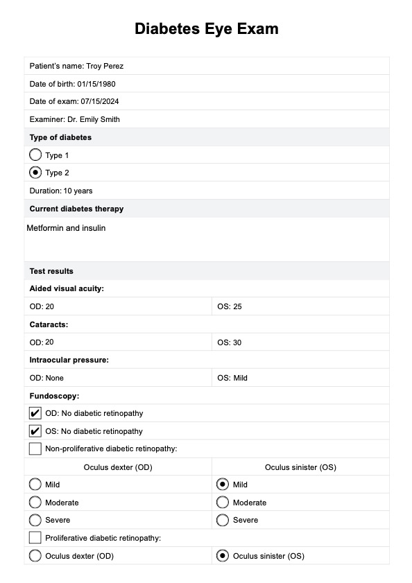 Descargue la plantilla gratuita en PDF de Carepatron para un examen ocular de la diabetes a fin de garantizar un seguimiento y un cuidado minuciosos de la salud ocular de los pacientes diabéticos.