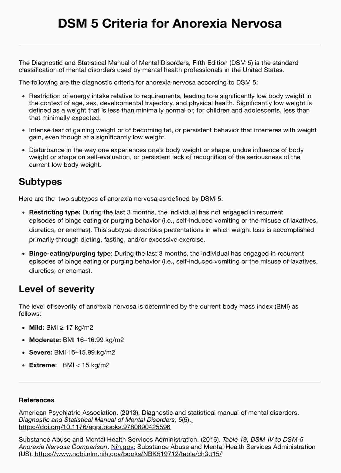 Criterios DSM 5 para la anorexia nerviosa (manual diagnóstico y estadístico de trastornos mentales) Template