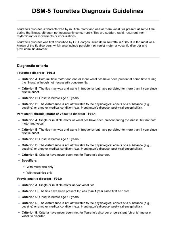 Conozca las guías del DSM-5 para el diagnóstico del síndrome de Tourette, incluidos los criterios, las opciones de tratamiento y el apoyo. Utilice nuestra Plantilla para consultarla fácilmente.