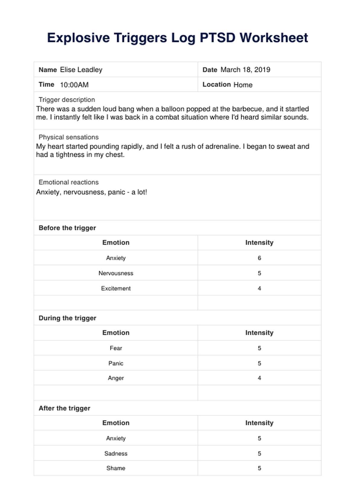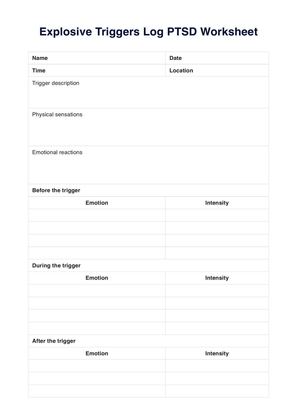 Descargue nuestra hoja de trabajo gratuita Registro de desencadenantes explosivos TEPT para realizar un seguimiento de los desencadenantes, las reacciones y las estrategias de afrontamiento de su cliente. Acceda a la plantilla en PDF aquí.
