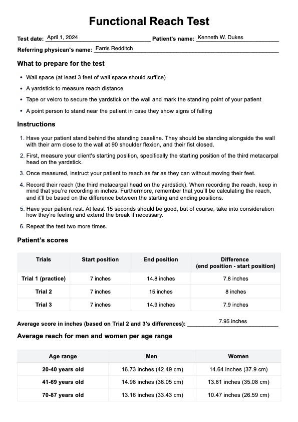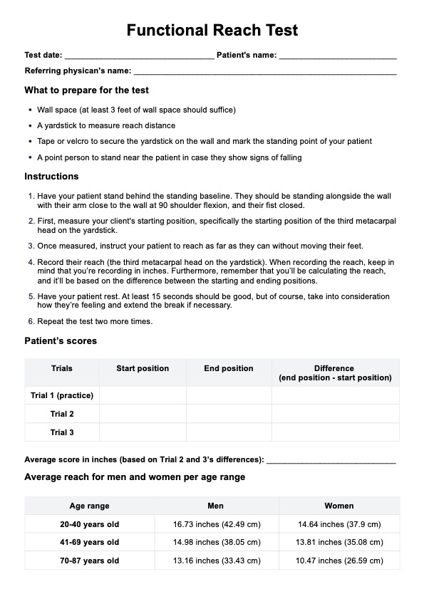 Sí. La Prueba de Alcance Funcional no sólo es fácil de hacer, sino que es fiable y válida porque estás trabajando con números. Usted está observando hasta dónde pueden extender su alcance y calcula la media basándose en los tres ensayos. Hay designaciones asignadas para los rangos de alcance para evaluar el riesgo de caídas.
