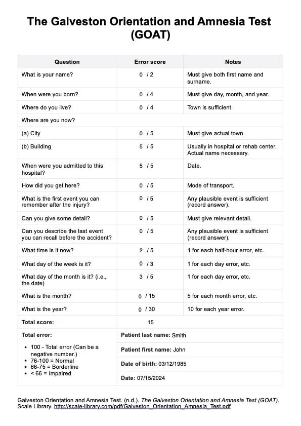 Prueba de orientación y amnesia de Galveston (GOAT) Template