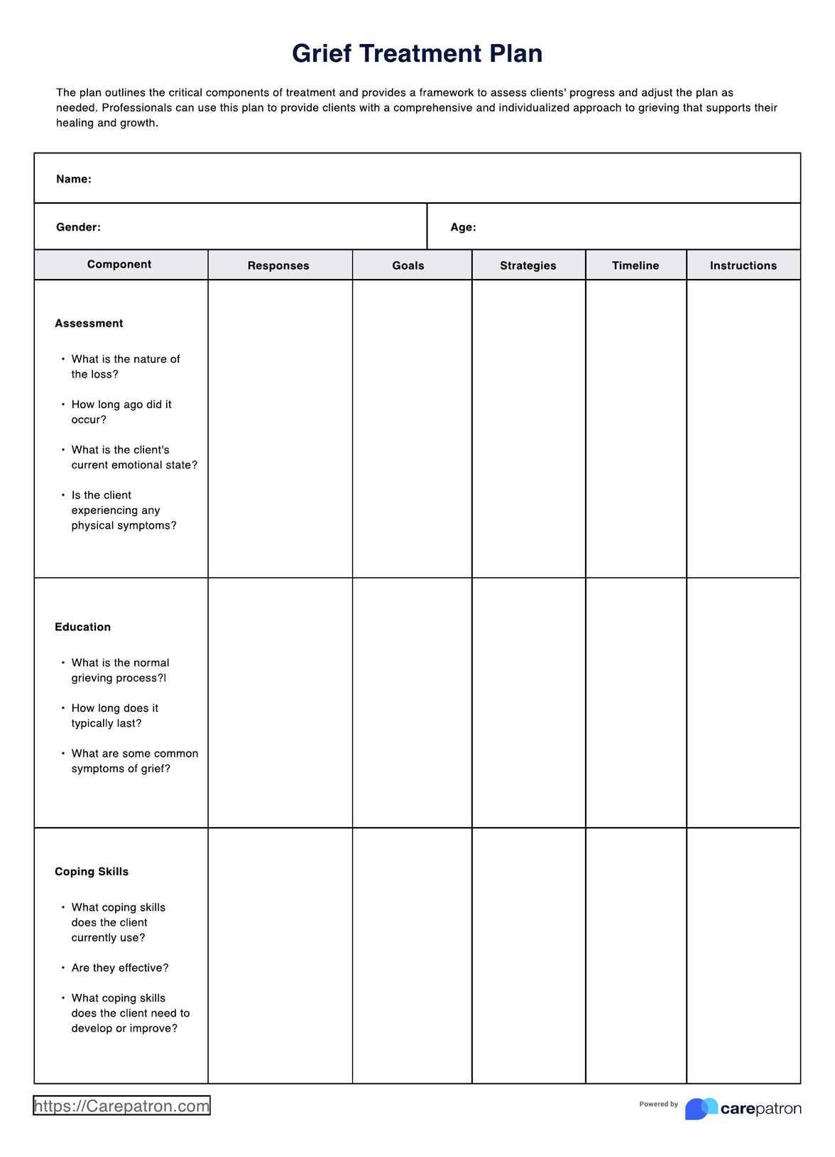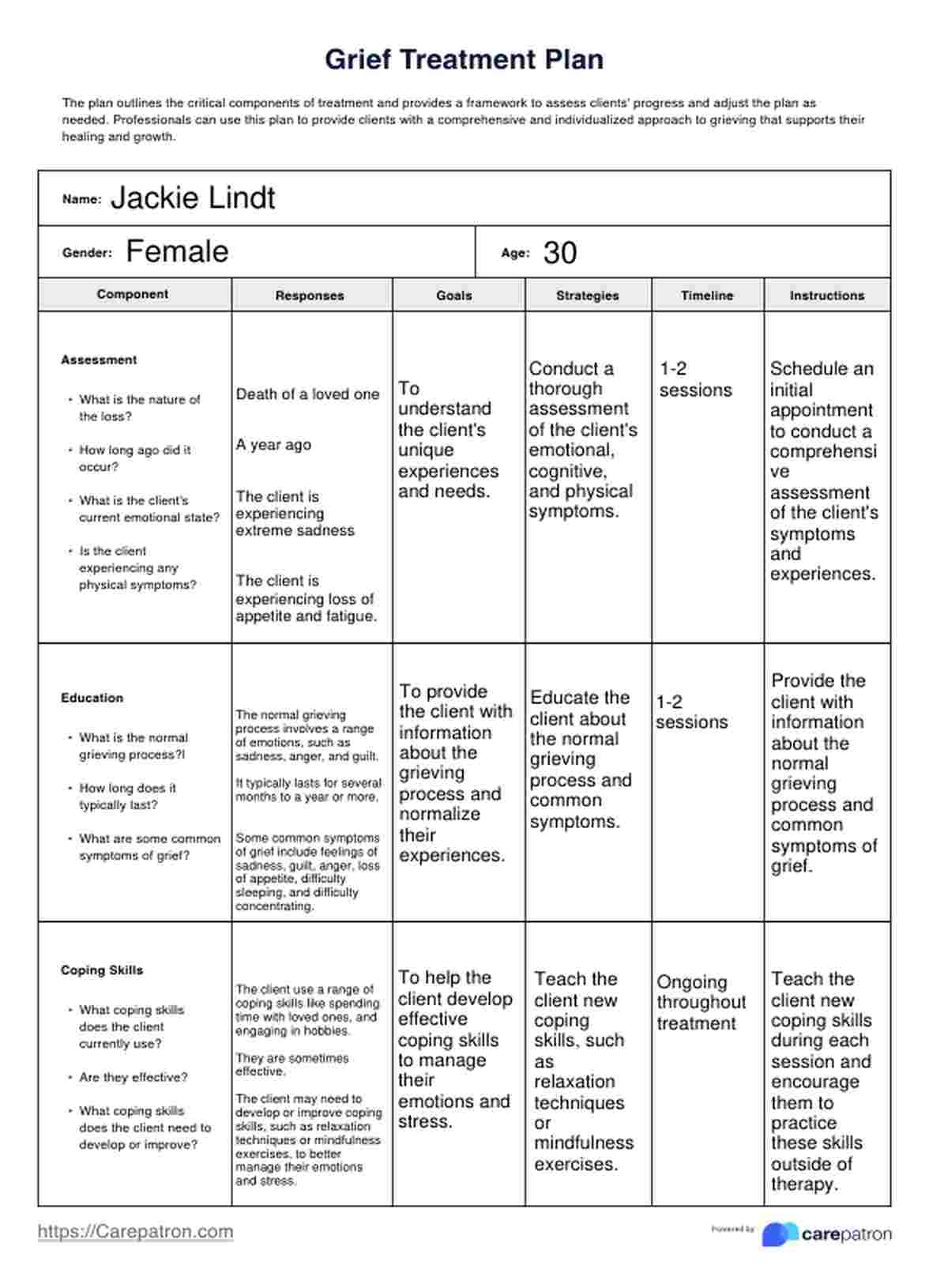 Para redactar un plan de tratamiento del duelo, hay que tener en cuenta la naturaleza de la pérdida, el estado emocional actual del cliente, sus habilidades de afrontamiento, su trabajo de duelo y su sistema de apoyo. A continuación, establezca metas y objetivos claros y cree un enfoque estructurado y personalizado del duelo.