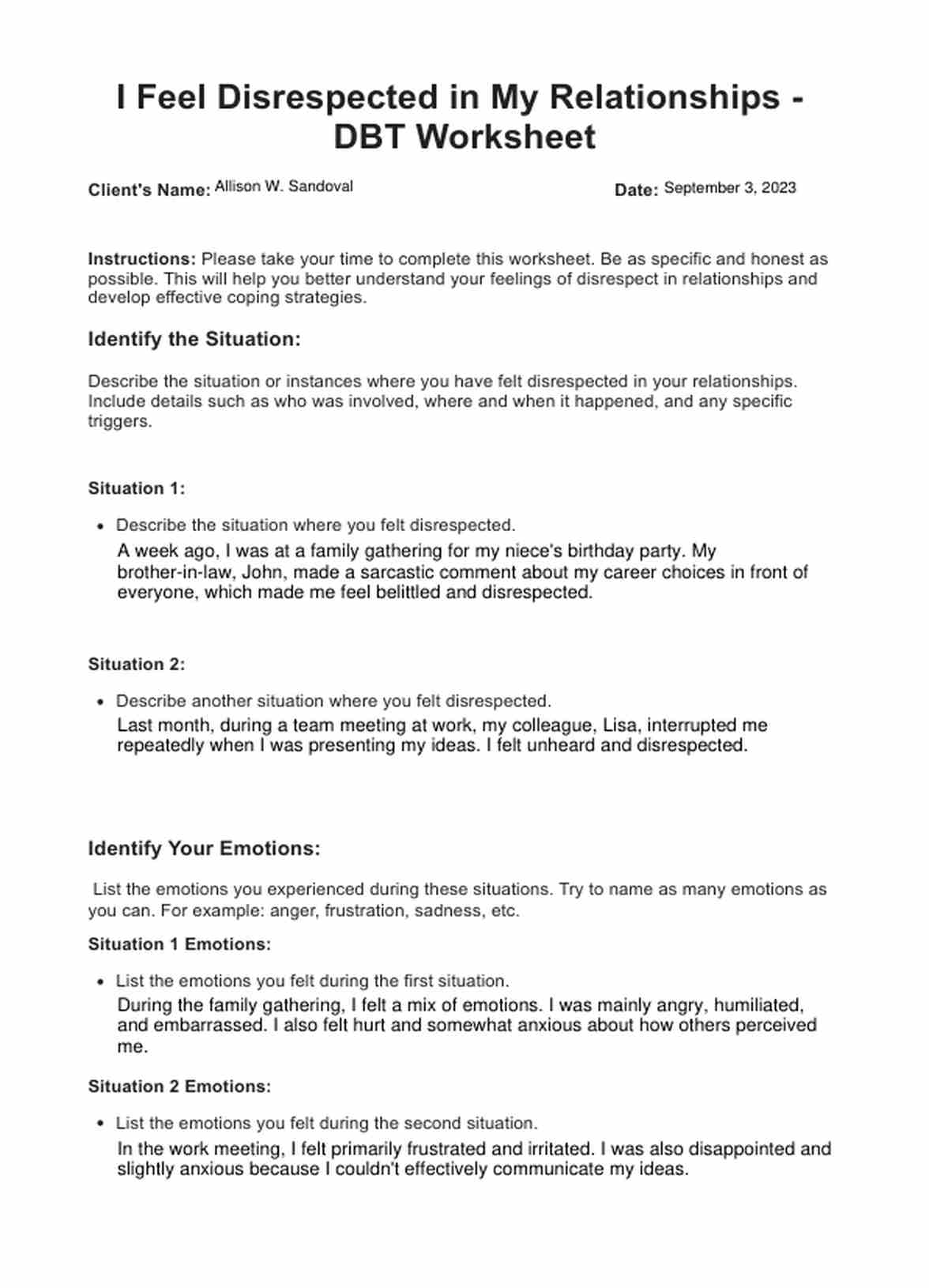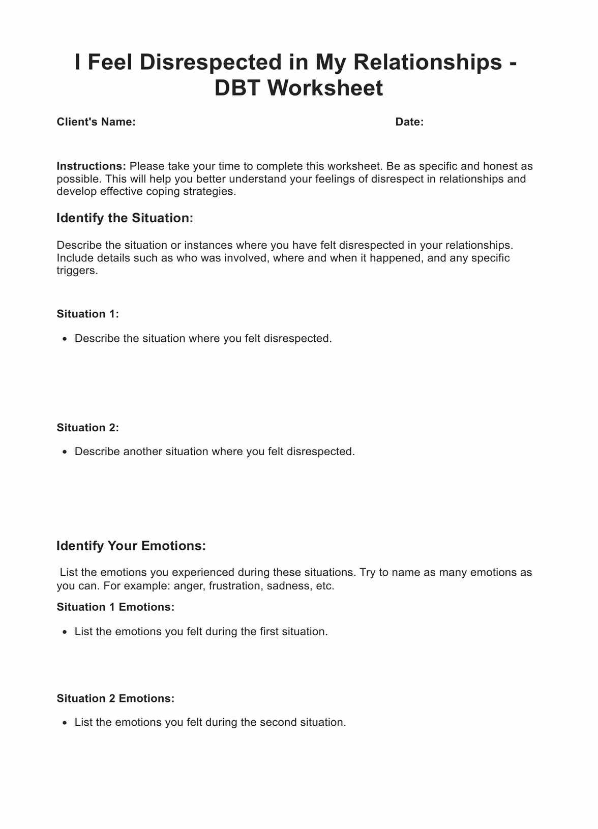 Potencie su crecimiento emocional con la "Hoja de trabajo DBT Me siento irrespetado en mis relaciones" para obtener soluciones sanitarias eficaces.
