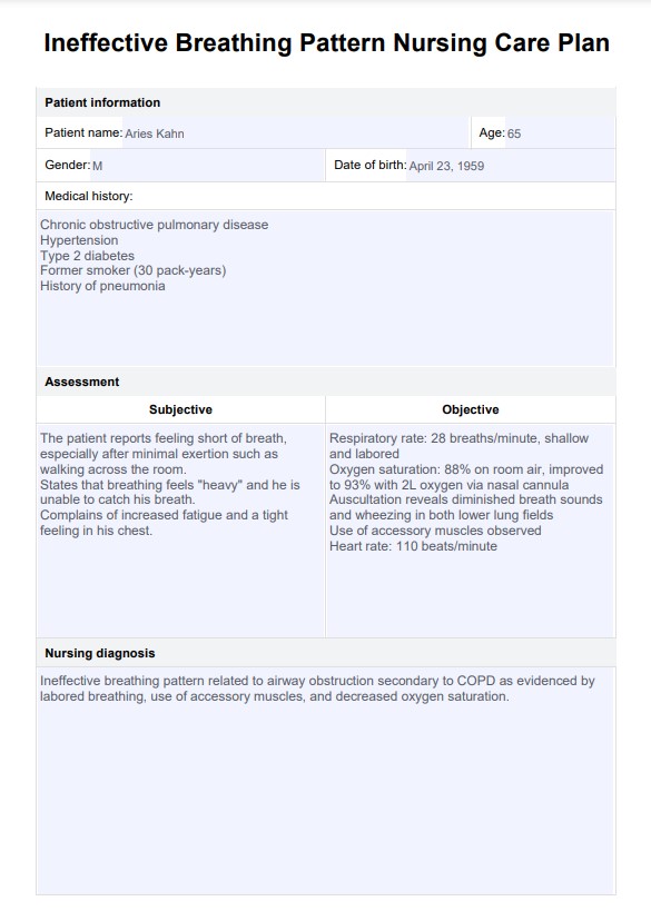 Agilice la atención al paciente con nuestra Plantilla de plan de cuidados de enfermería con patrón de respiración ineficaz, ideal para una gestión respiratoria eficaz.