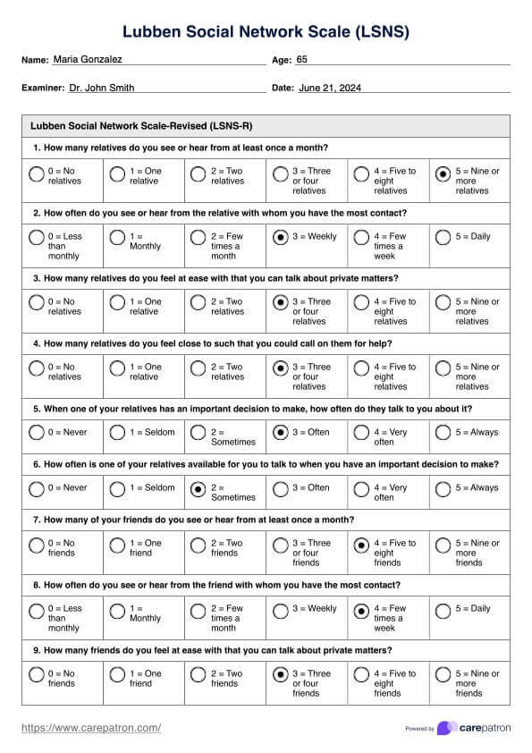 La Escala de redes sociales de Lubben (LSNS) es crucial en el ámbito clínico, ya que ayuda a los médicos a detectar el aislamiento social de los pacientes. Reconocida por su consistencia interna y su fiabilidad, la LSNS relaciona el aislamiento social con diversos riesgos para la salud, lo que pone de relieve su importancia para facilitar la salud al final de la vida. Al identificar el aislamiento a tiempo, los clínicos pueden intervenir para mitigar eficazmente los problemas y riesgos de salud física asociados.