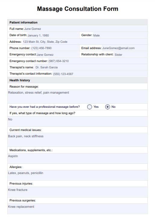 Tanto los masajistas como sus clientes utilizan el Formulario de consulta para masajes para recopilar y proporcionar información esencial antes de una sesión de masaje.