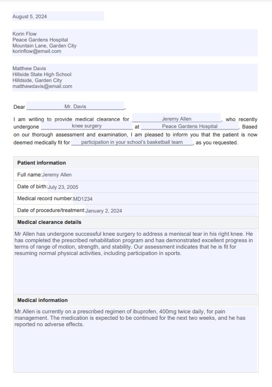 Una Carta de Autorización Médica suele incluir el nombre del paciente, una declaración sobre su estado de salud, la evaluación del profesional de la salud sobre la capacidad del paciente para someterse al procedimiento o actividad de forma segura y cualquier recomendación sobre los cuidados o restricciones necesarios.