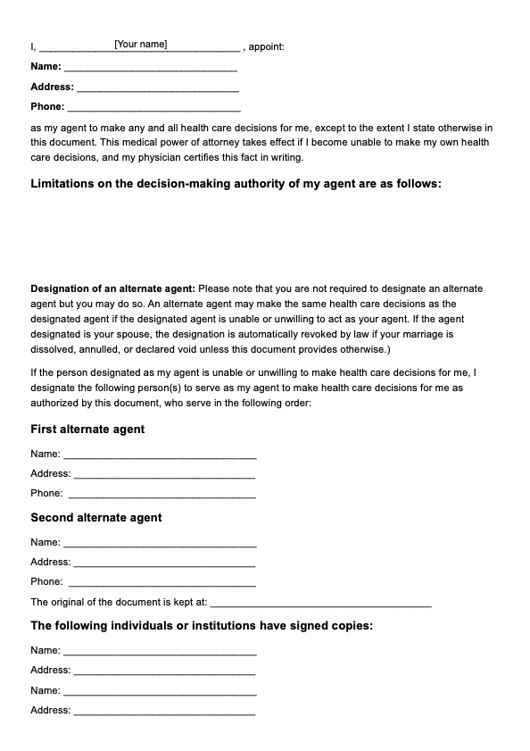 Infórmese sobre los formularios de poder médico y descargue una muestra gratuita para designar a una persona de confianza que tome decisiones médicas en su nombre.