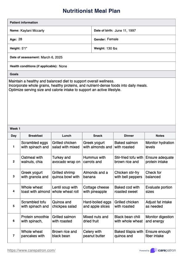 ¿Busca un plan de comidas aprobado por un nutricionista? Descargue el PDF gratuito de Carepatron con un ejemplo de plan de comidas diseñado por un nutricionista para ayudarlo a alcanzar sus objetivos de salud.