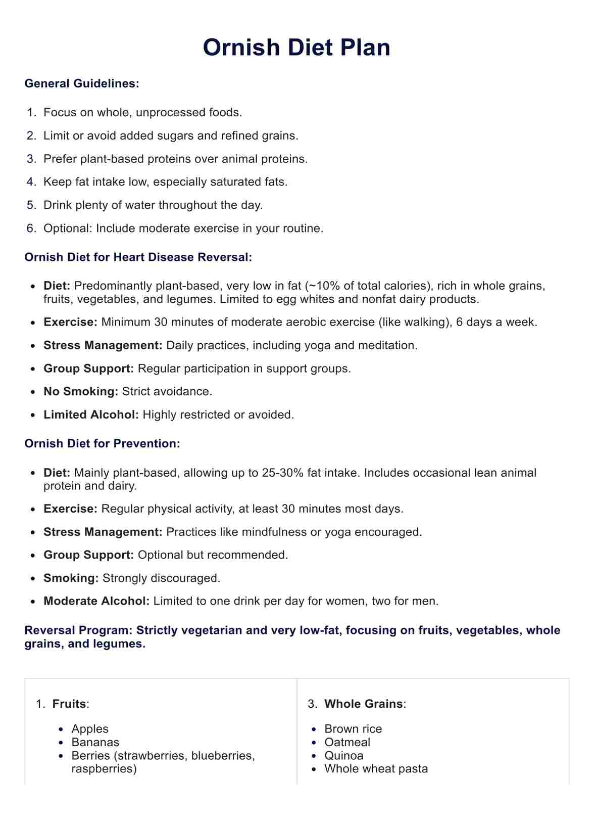 La dieta Ornish es un plan nutricional y de estilo de vida desarrollado por el Dr. Dean Ornish. Se basa principalmente en las plantas y hace hincapié en el consumo de cereales integrales, frutas, verduras y legumbres, al tiempo que limita la ingesta de grasas, en particular las saturadas y las trans.