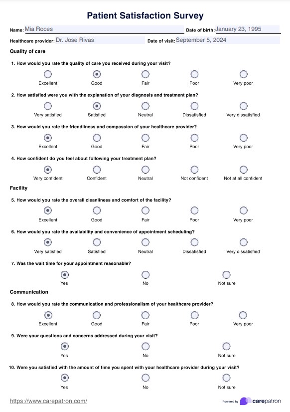 Mejore la calidad de la atención con la encuesta de satisfacción del paciente de Carepatron. Obtenga información valiosa sobre las experiencias de los pacientes y tome decisiones con conocimiento de causa.