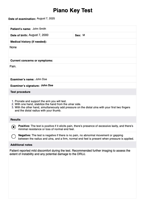 Para realizar la prueba de la tecla de piano, el clínico debe tener al paciente sentado con el antebrazo colocado sobre una superficie estable. A continuación, el clínico estabilizará firmemente el antebrazo del paciente con una mano mientras utiliza la otra para ejercer presión sobre el cúbito distal, empujándolo dorsalmente. Una prueba positiva está indicada por un desplazamiento dorsal excesivo de la cabeza del cúbito y puede causar dolor o molestias al paciente.