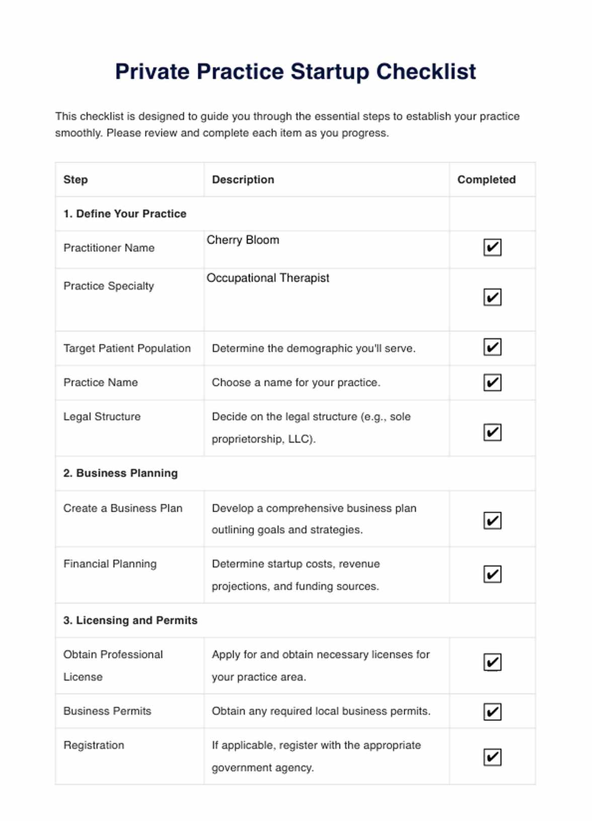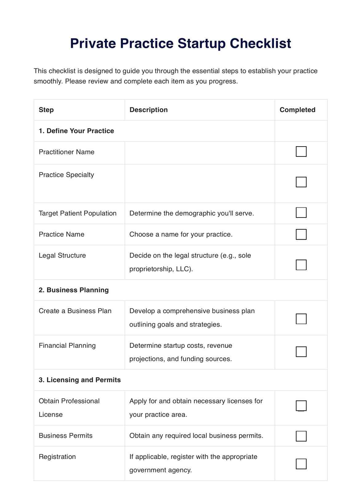 Lista de verificación para empresas emergentes de consultorios privados Template