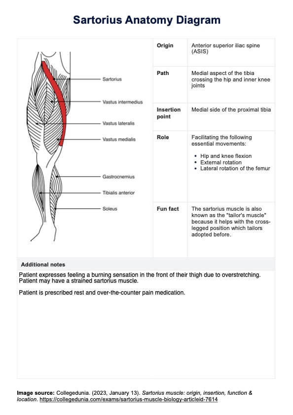 Obtenga una copia de nuestro Diagrama de anatomía del sartorio para beneficiarse de sus usos educativos y clínicos, incluido el dominio de la anatomía del músculo sartorio.