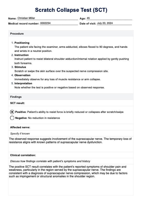 Durante la prueba de colapso por rascado (SCT), el paciente permanece de pie frente al examinador con los codos flexionados a 90 grados. El examinador aplica un rasguño o barrido sobre la piel que cubre el nervio sospechoso de compresión mientras el paciente mantiene la resistencia. Se produce una prueba positiva si el paciente pierde involuntariamente la resistencia, lo que indica una disfunción del nervio.