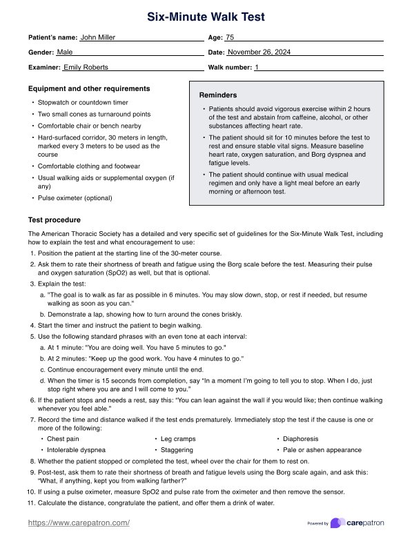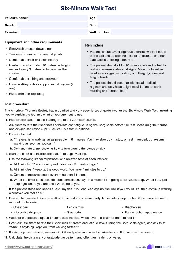 La prueba de los seis minutos a pie es una evaluación clínica de bajo riesgo. Mientras se lleva a cabo la evaluación, se puede disponer fácilmente de asistencia Médica.
