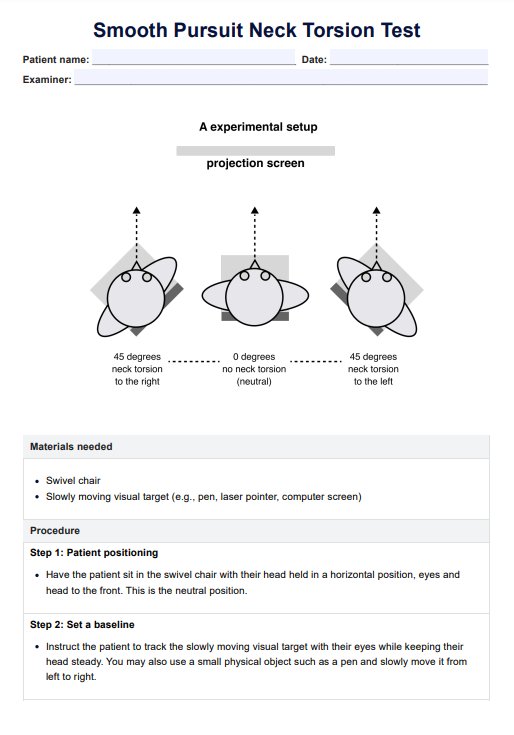 Explore nuestra plantilla gratuita de prueba de torsión cervical para diagnosticar el mareo cervicogénico con pasos detallados y ejemplos precisos.