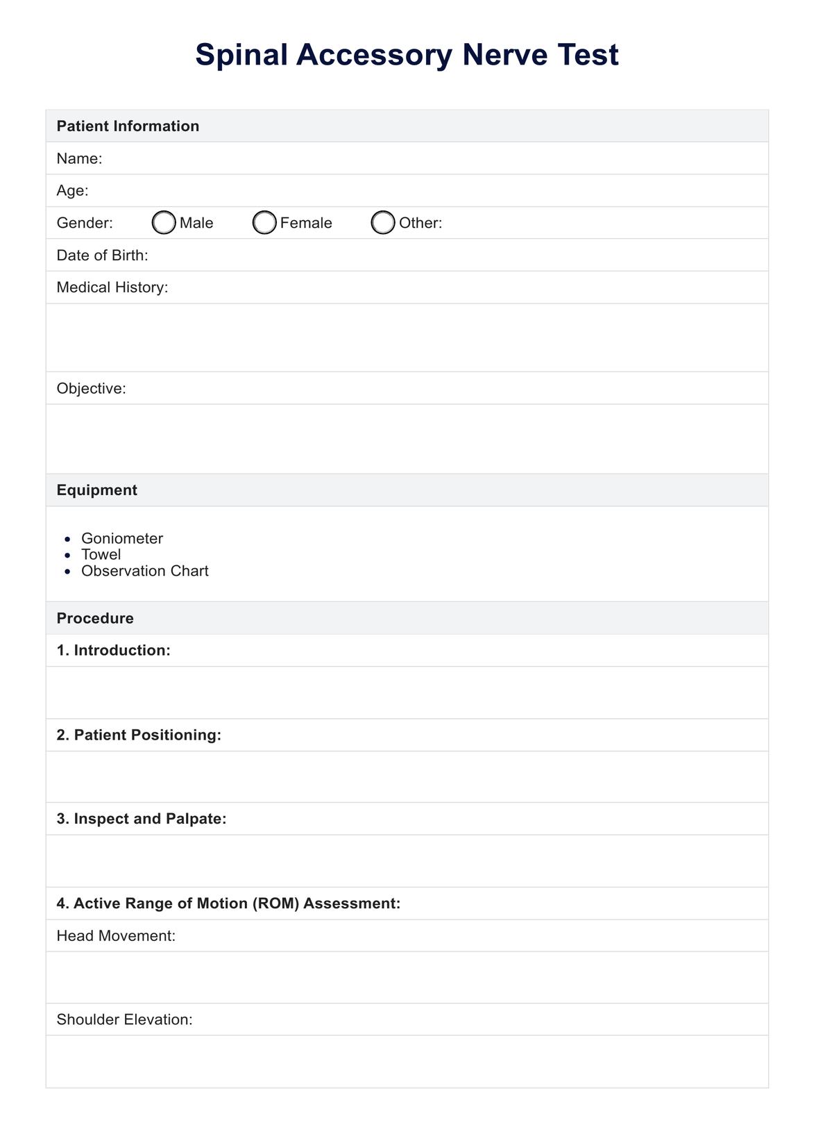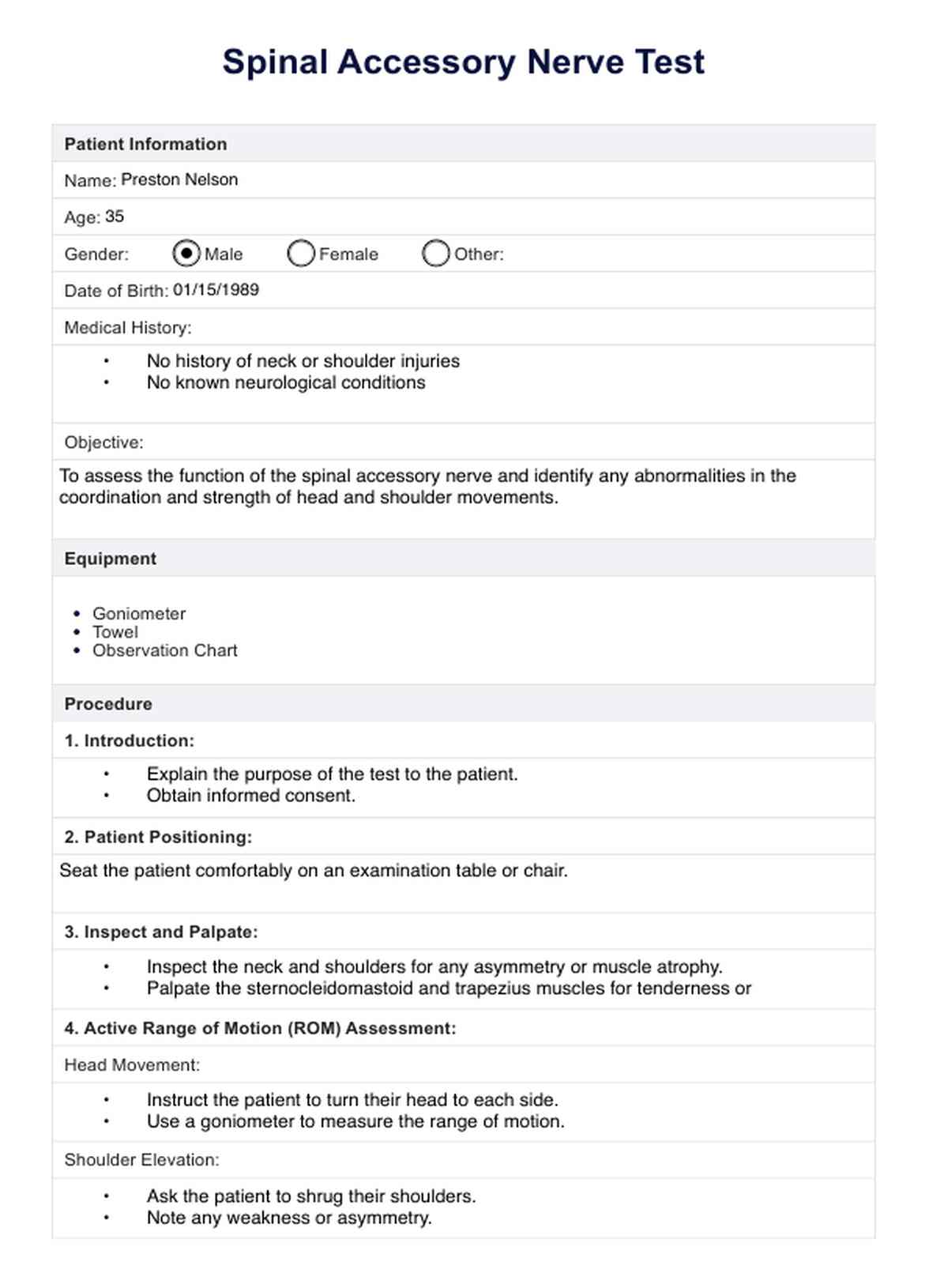 Descubra cómo realizar una prueba del nervio accesorio espinal con nuestra completa guía y nuestro ejemplo. Descargue el PDF gratuito de Carepatron como referencia.