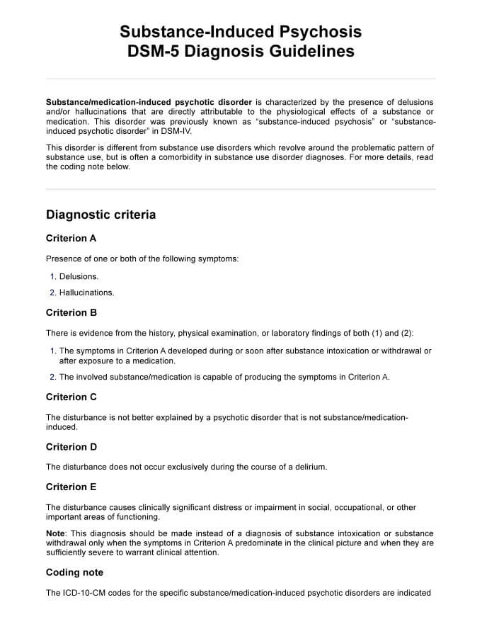 El Manual Diagnóstico y Estadístico dispone de códigos CIE-10-CM para el trastorno psicótico inducido por sustancias o medicamentos, pero varían en función de la sustancia y de la presencia de un trastorno por consumo de sustancias comórbido. Consulte nuestra Plantilla para ver una tabla detallada de códigos.