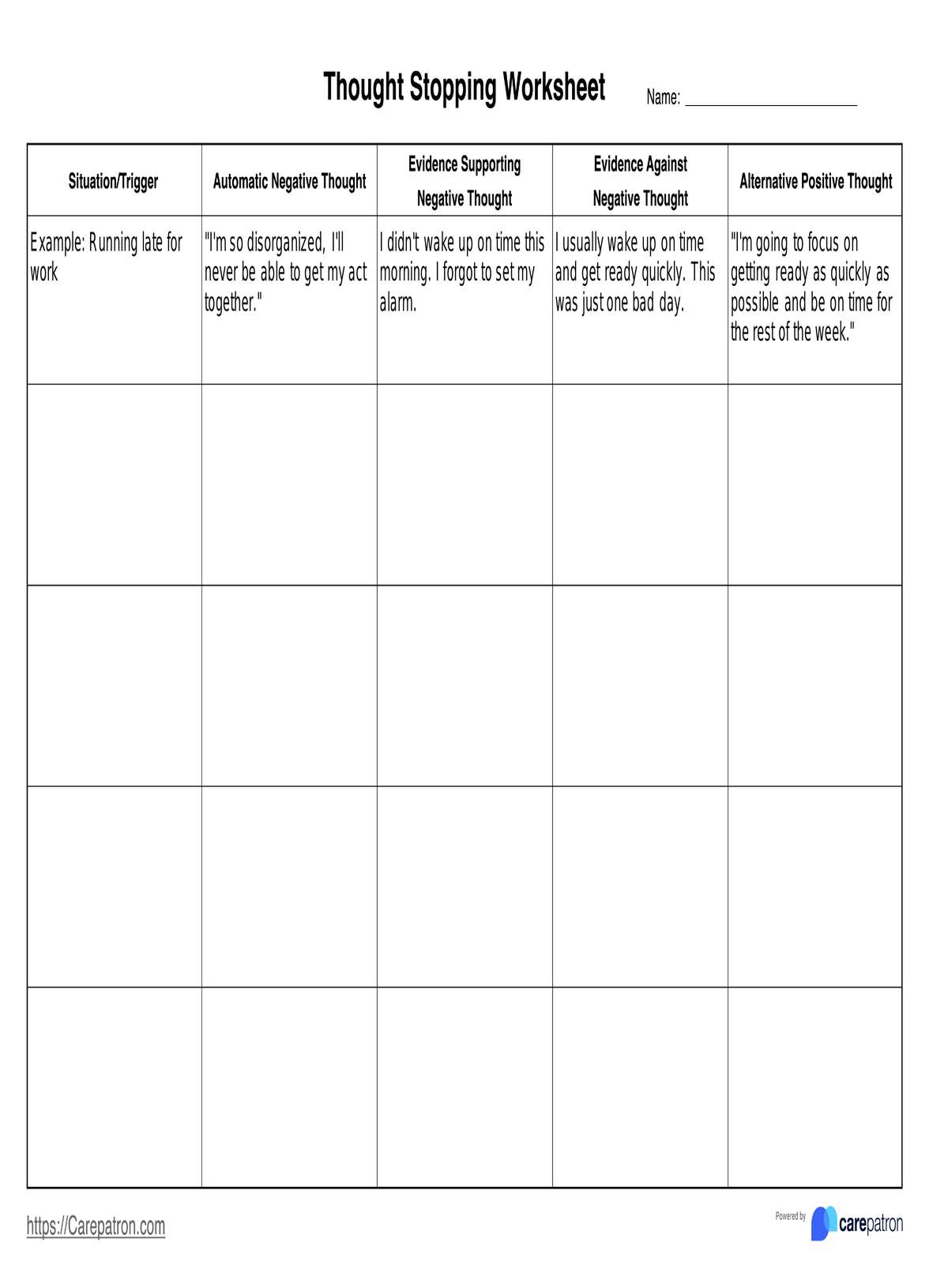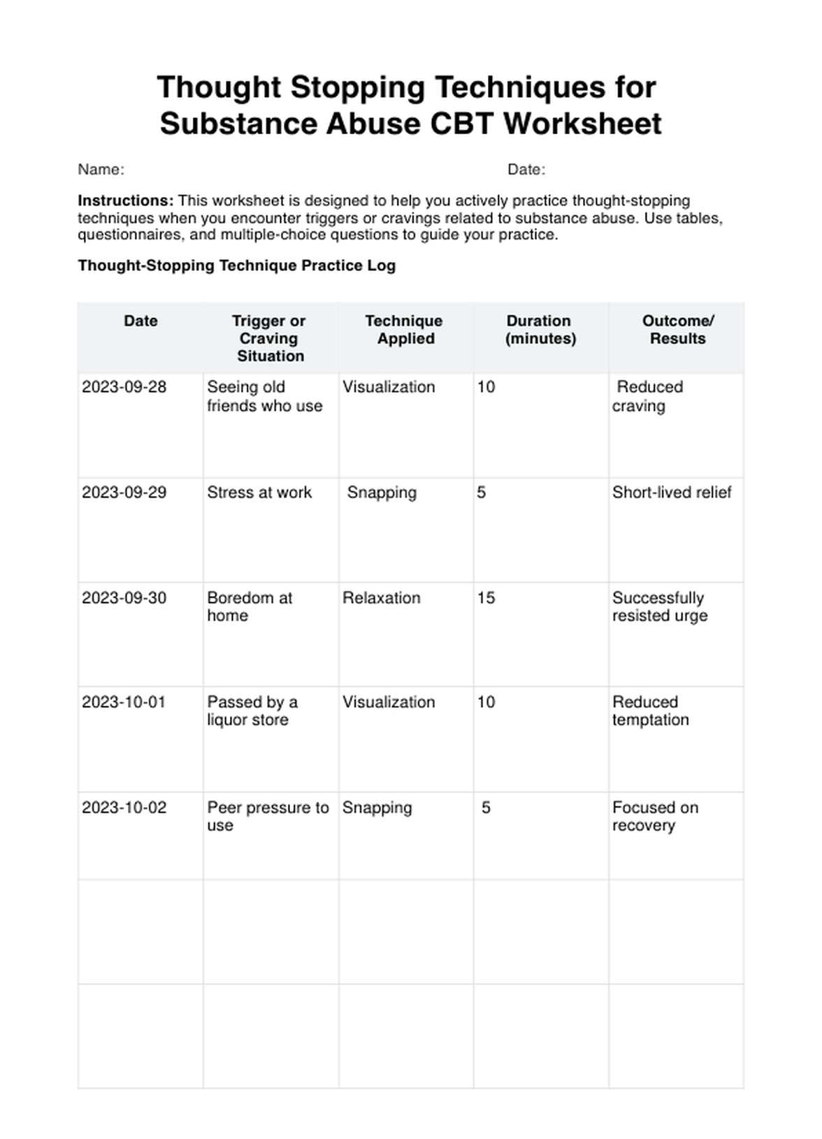 Hoja de ejercicios de técnicas de detención del pensamiento para el abuso de sustancias Template