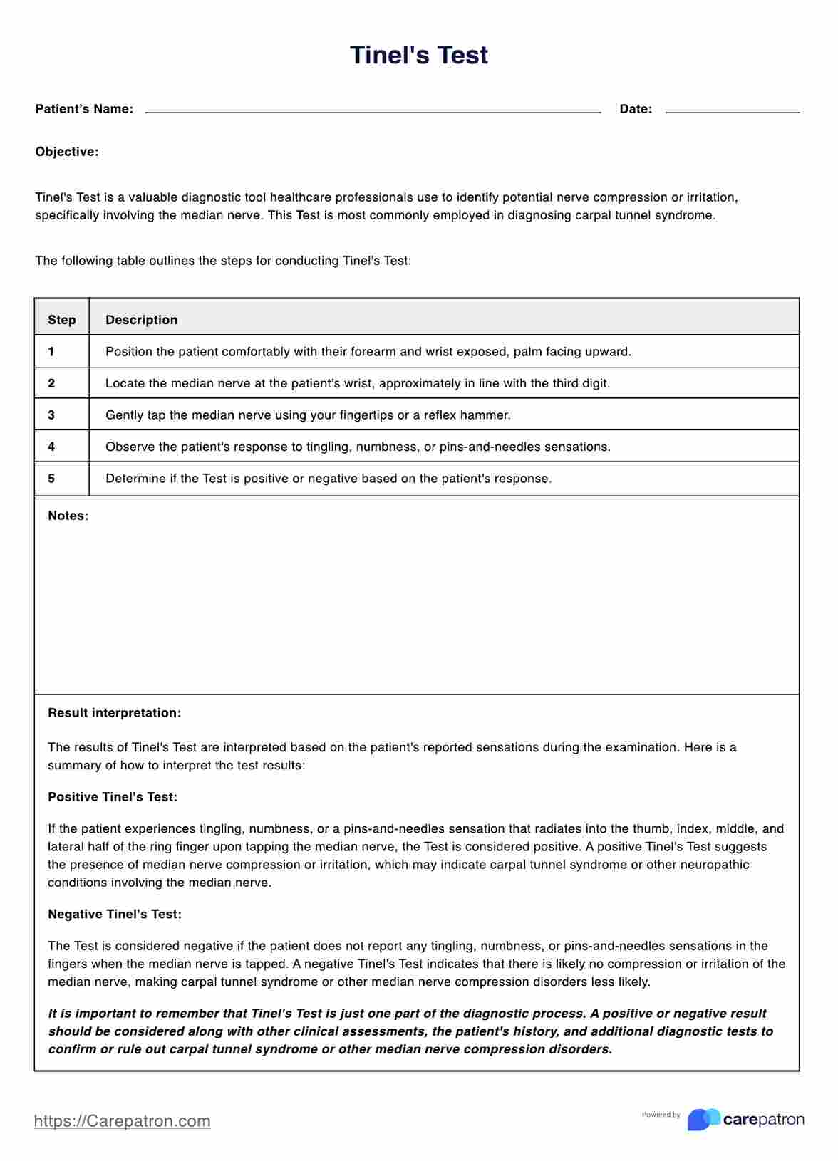Descubra lo esencial de la prueba de Tinel, una herramienta de diagnóstico para la compresión nerviosa, con una guía paso a paso, puntuación y una descarga gratuita en PDF.