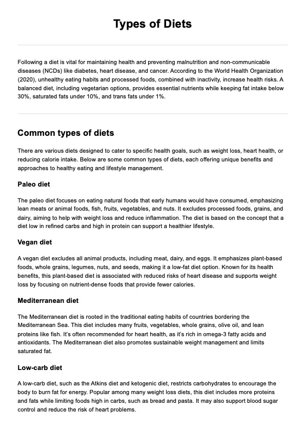 Lea nuestra Plantilla PDF gratuita de Tipos de dieta, diseñada para que los profesionales de la salud orienten a los pacientes en la elección de la mejor dieta para sus objetivos de salud y necesidades dietéticas.